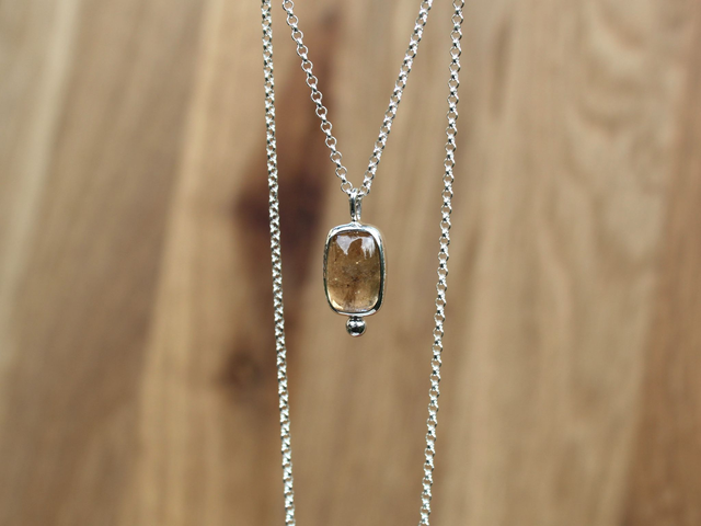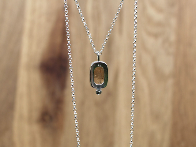 Dieser handgefertigte Anhänger kombiniert die natürliche Schönheit des Edelsteins mit einem symbolischen Detail: Ein kleines Kügelchen an der Fassung, das eine Weintraube repräsentiert und dem Design eine zusätzliche Bedeutung verleihen. Die offene Rückseite des Anhängers lässt das Licht sanft in den Stein einfallen, wodurch seine Farben und Strukturen noch lebendiger erscheinen.